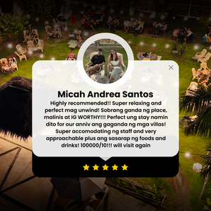 Extra Pax: For each additional guest beyond the declared count, there is a fee of P2,000 per night. If an extra guest is undeclared, a fee of P3,000 per night will apply.
